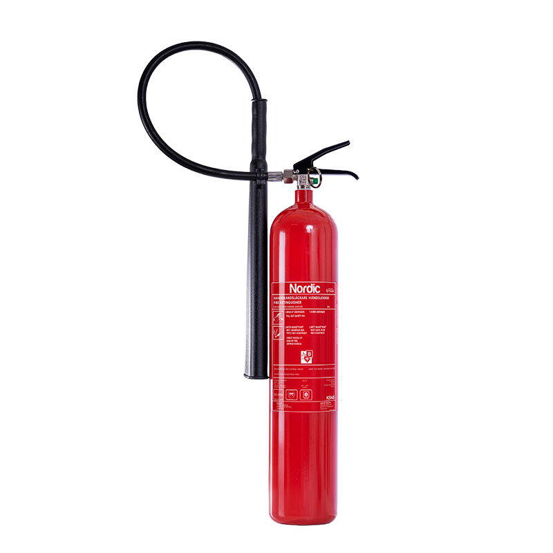 Koldioxidsläckare K5NS från Nordic med en tömningstid på 10 sekunder. Mest lämplig för att släcka bränder i vätskor, gaser och elektronisk utrustning.